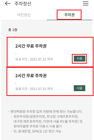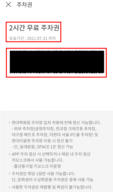 주차권을 클릭 후 위 이미지처럼 '현대백화점 2시간 무료 주차권' 이 보입니다.